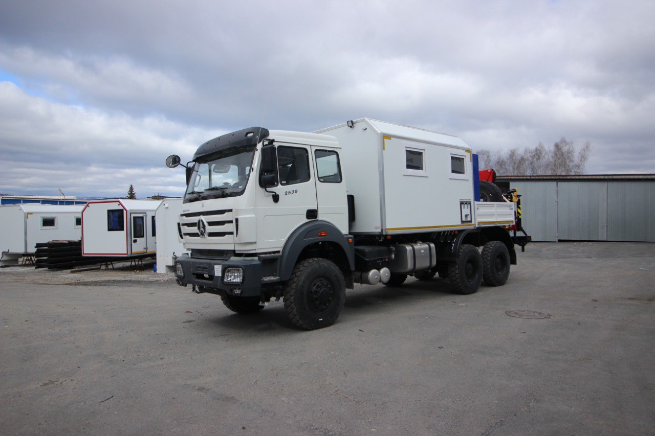 Передвижная мастерская на базе шасси Beiben 2538LTR с установленной крано-манипуляторной установкой (КМУ) ИМ 77 — это специализированная техника для организации мобильного сервиса, обслуживания, ремонта оборудования и проведения монтажных работ на объектах в условиях отсутствия стационарной мастерской. Такая машина часто используется в энергетике, на стройплощадках, в промышленности, на объектах связи и других отдалённых площадках.