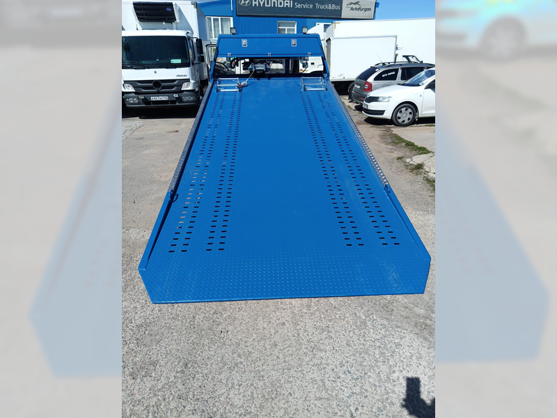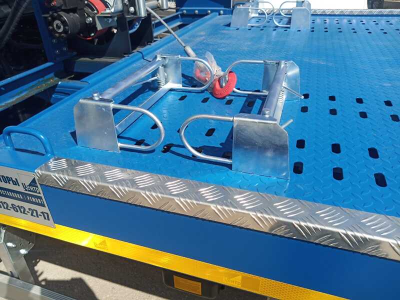 - В передней части платформы имеется подвижная площадка под установку лебедки. По периметру платформа обрамляется отбортовкой из оцинкованного профиля. На платформе установлены 4 скоб для стяжных ремней.Рама наклонная – стальной каркас. Продольные балки – труба стальная прямоугольного сечения 100х50х4 мм. Поперечные балки в задней части рамы труба 100х50х4 мм